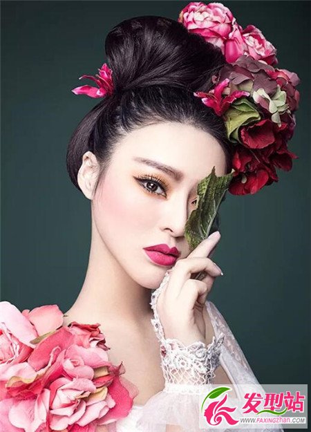 做美妆的时尚设计师们,都是把自己的时尚理念付诸搭配上,比如这里饱满的盘发,利用鲜花来衬托出妖艳妩媚,妆容更显成熟。